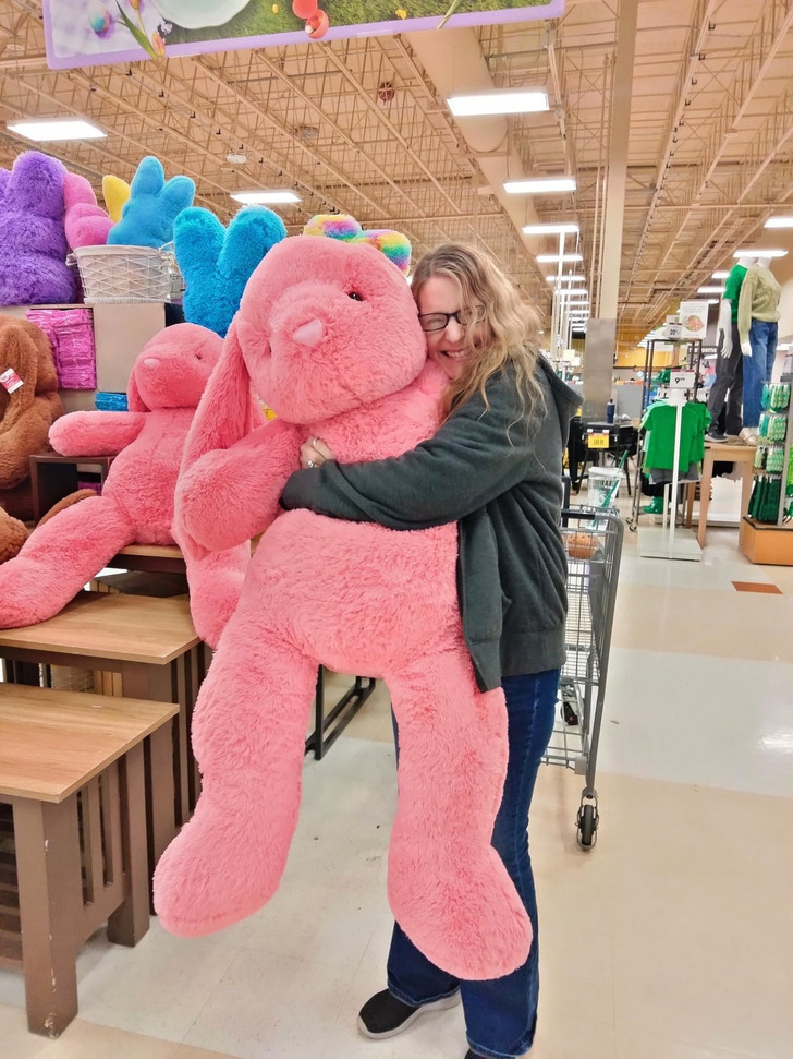 «Только посмотрите на эту широченную улыбку! Мама обнимается с гигантским плюшевым зайцем»