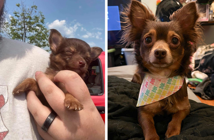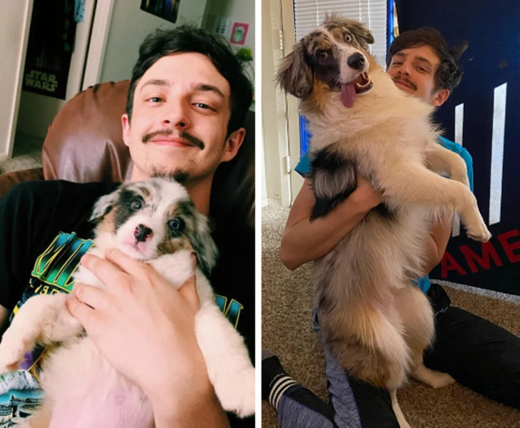 «На первом фото моему песику всего 2 месяца, а на втором — уже 10. Он до сих пор думает, что он малыш»