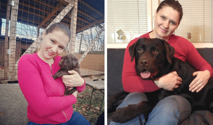 «Мой шоколадный лабрадор Эдди. Справа ему всего 1 месяц, а слева — уже целый год»