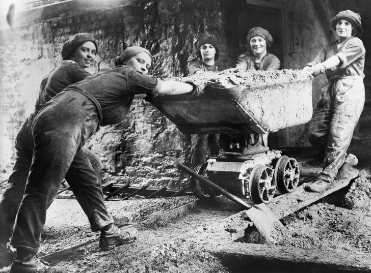 Группа работниц перевозит тачку с глиной для производства силикатного кирпича на заводе в Южном Уэльсе (1910-е)