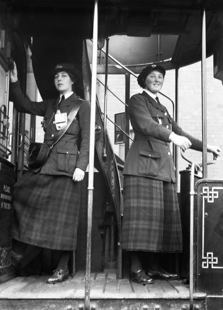 Женщина-водитель трамвая (справа) и кондуктор (слева) в Глазго (1918)