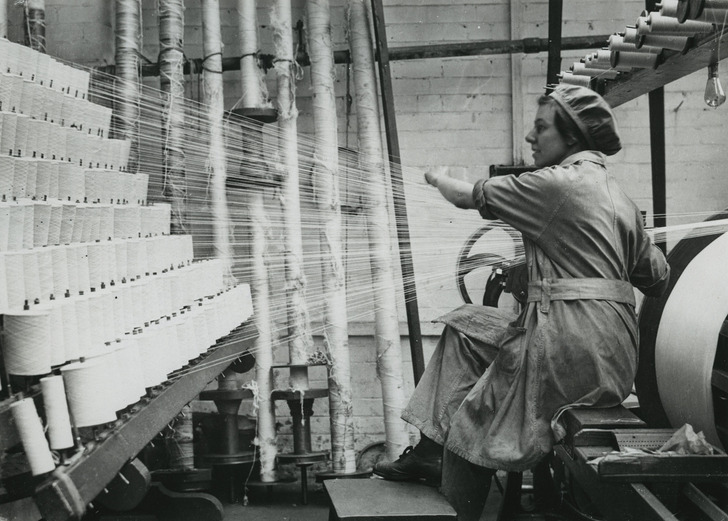 Британская женщина наматывает хлопок с катушек на валики на кружевной фабрике в Ноттингеме (1914)