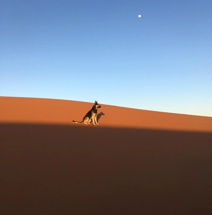 Наверное, собачка долго ждала этого момента, чтобы так изящно вписаться в пустынный пейзаж