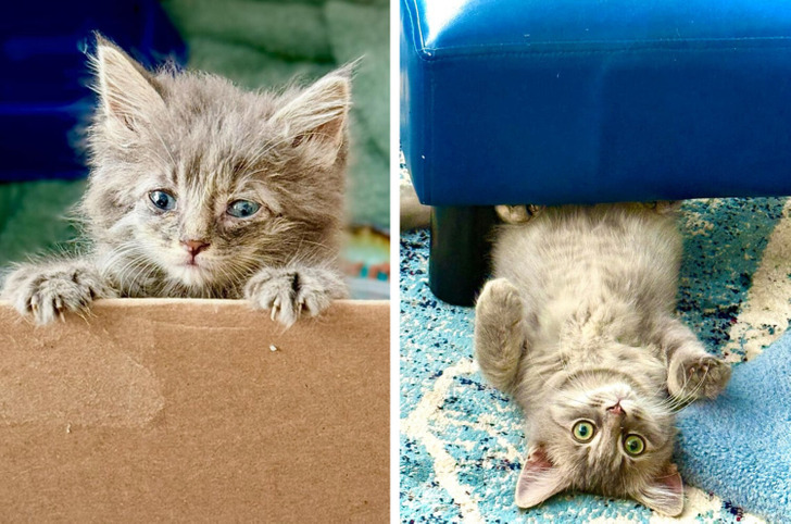 «Испуганный котенок „до и после“. Разница около 10 месяцев»
