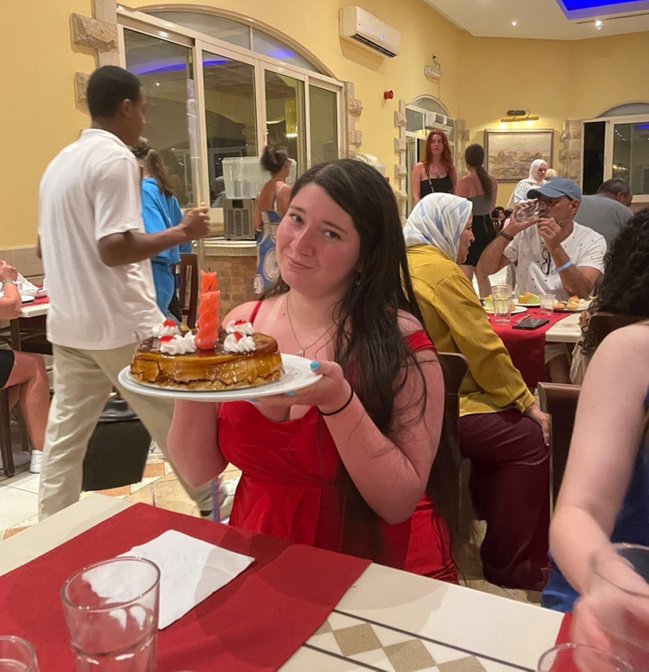 - Решили отметить мой день рождения с мамой в Египте. И вот сидим мы за праздничным ужином с ней и подружками. Вдруг мама говорит, что отойдет. Минут десять ее нет. Мы уже переживать стали. Оказалось, что все это время она бегала по ресторану и пыталась выбить обещанное поздравление для меня у персонала ресторана — с тортиком, барабанами и песнями. Подходила то к одному менеджеру, то к другому, а они все не могли понять, что она пытается им объяснить. На ресепшене пообещали все сделать, а в ресторан, видимо, просьбу так и не передали. В итоге официанты быстренько побежали репетировать игру на барабанах и искать мне свечи. Тортик в итоге был со столовыми свечами. Но как же я была в этот день счастлива. Такое приятное воспоминание.
