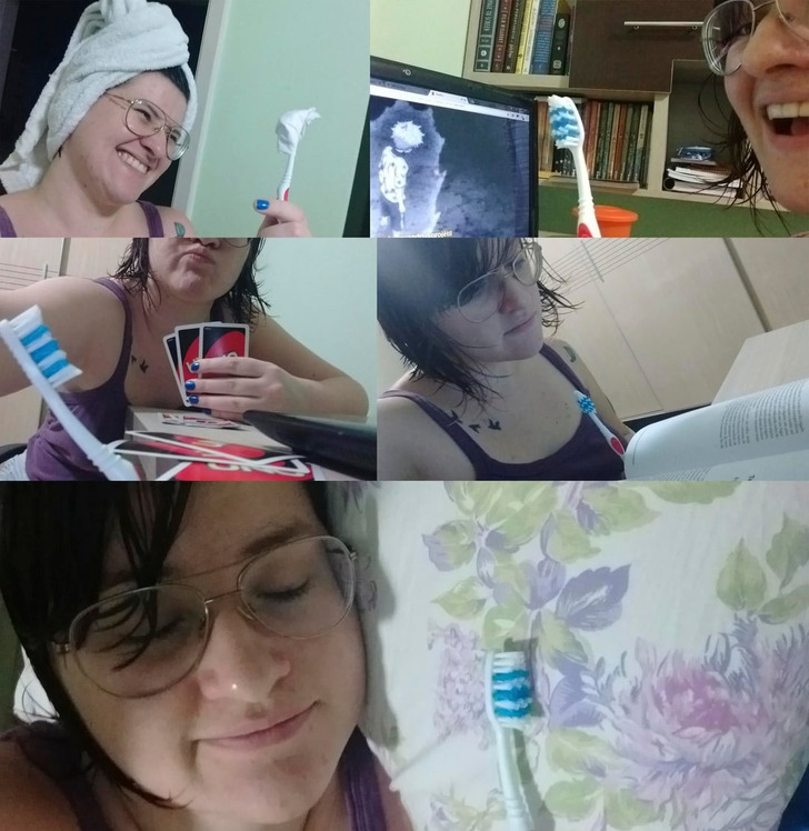 «Мой друг забыл у меня дома свою зубную щетку. Я отправила ему эти фото, чтобы показать ему, как хорошо о ней забочусь»
