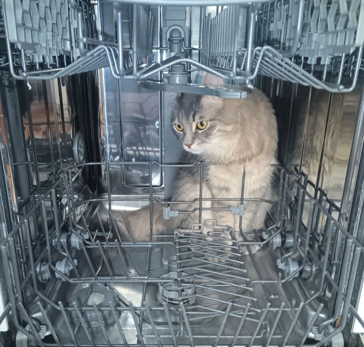 Этот кот каждый раз проверяет посудомойку перед тем, как хозяева ее загрузят. А как ваш питомец помогает по хозяйству?