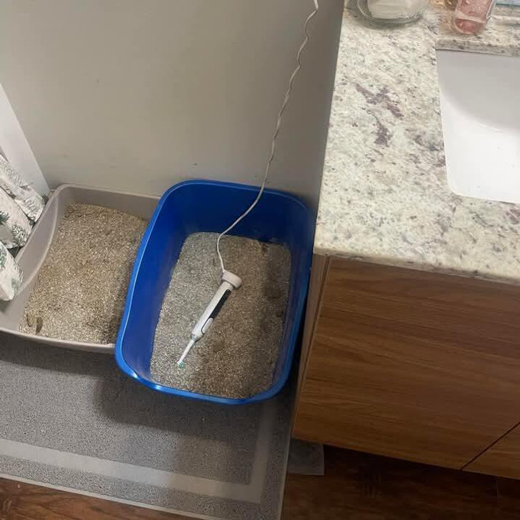 На фото зубная щётка, наверное, случайно упала в кошачий лоток, а моя киса прчти всегда старается зарыть свои отходы моей обувью, подтаскивает к лотку зимний сапог, но, к счастью, перевалить через бортик не может, тяму не хватает. 😼