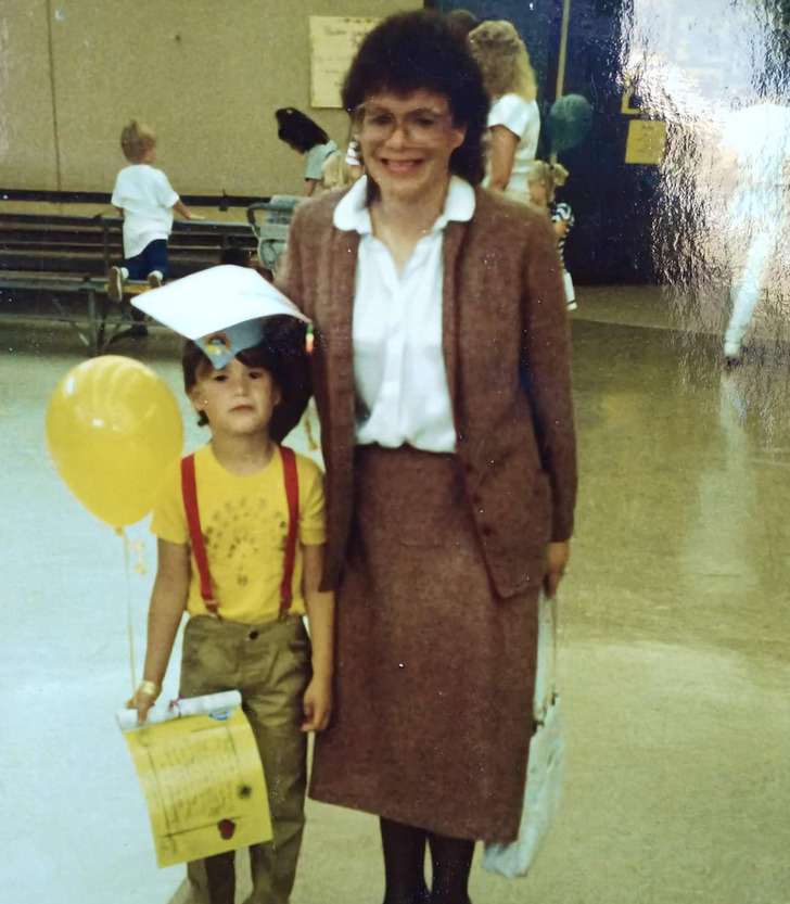 «А вот моя мама — забежала ко мне на выпускной в детском саду во время своего обеденного перерыва, 1988 год»