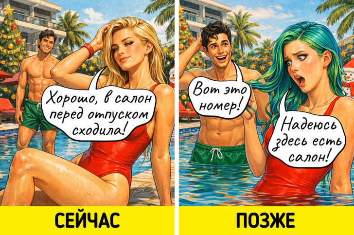 Иногда окрашенные волосы своеобразно реагируют на воду в бассейне. С другой стороны, можно получить интересный оттенок