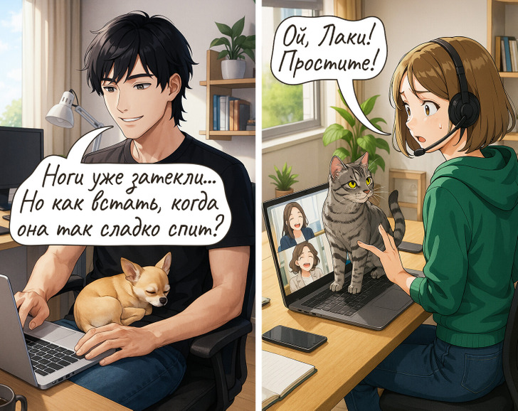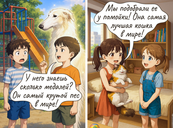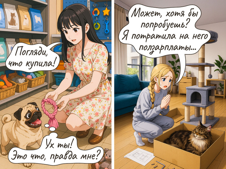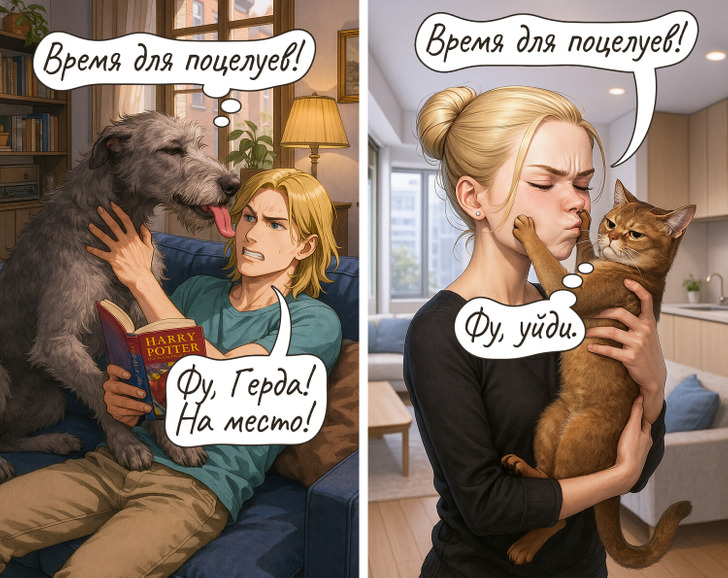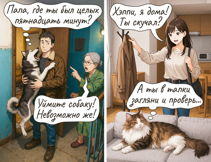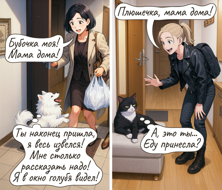Есть два разных мира: в одном пушистый друг радостно бежит к двери, лишь только в замке заскрипит ключ, а в другом — смотрит свысока, как на обслуживающий персонал. Эти отличия нашли свое отражение в наших маленьких зарисовках, где все так близко и знакомо сердцам любителей кошек и собак!