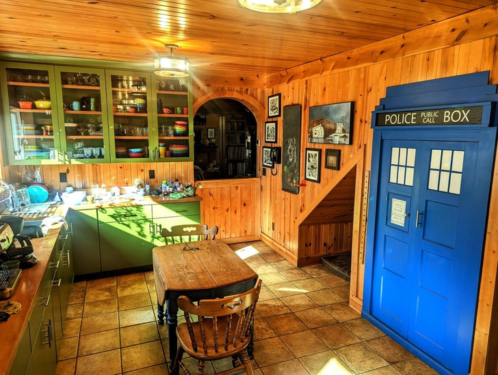 «Моя кухня-гостиная. Возле стола — полка с коллекцией кружек. А дисковый телефон я хочу подключить к мобильнику — мне просто нужен адаптер»