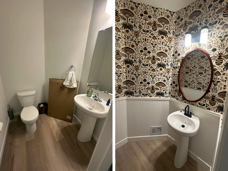 «Мы наконец-то купили дом после примерно 15 лет аренды, и я была так счастлива, что наконец-то смогла поклеить обои! Что вы думаете о моей ванной комнате?»