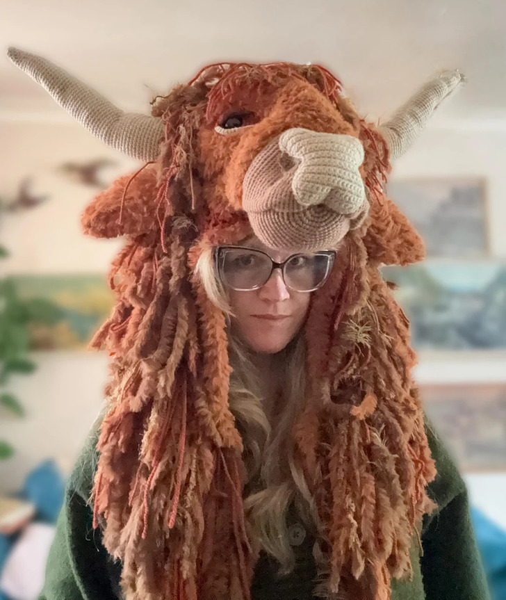 «Наконец-то у меня готова шапка в виде шотландской коровы!»