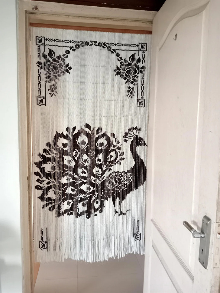«Это не моя идея, меня вдохновили воссоздание винтажные китайские занавески из стеклянных бусин. Они очень красочные. А моя черно-белая — выбор бусин был ограничен, поэтому я использовала то, что было под рукой»