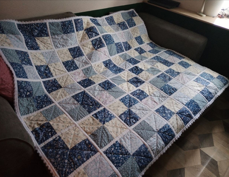 «Фотки не сохранились, но там хвастаться особо нечем. А потом я как-то втянулась, сшила одеяло маме на день рождения, а потом стала шить все больше и больше. Вот такое, например, получается из самых мелких лоскутов»