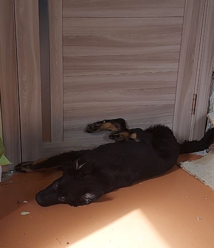 «Собачка не только подперла дверь спальни, но и при любой попытке ее подвинуть начинала верещать так, будто ей что-то прищемили. Стоило мне войти в квартиру, как она вскочила и поскакала как ни в чем не бывало.»