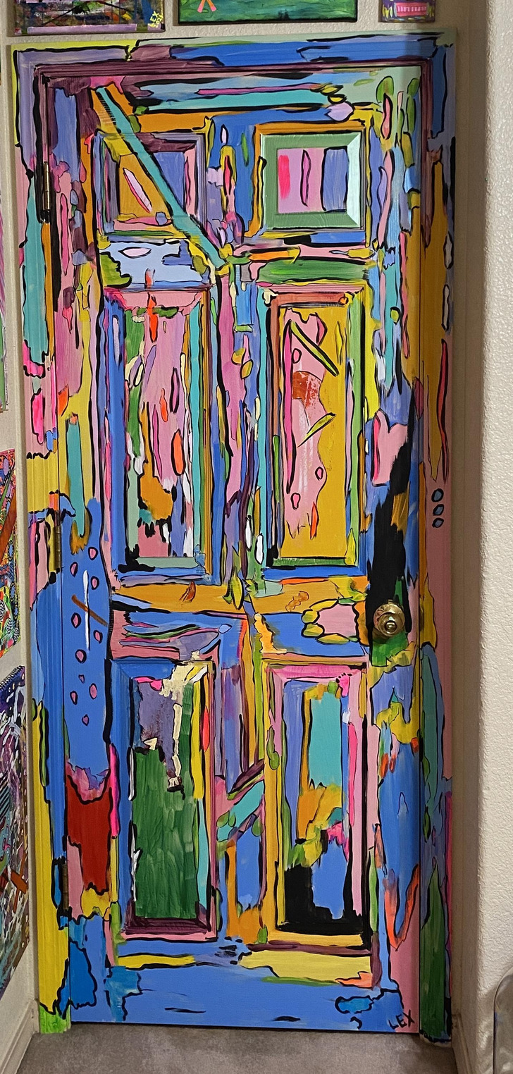 «Как вам моя дверь в мастерскую? Когда у меня оставалась краска, я просто мазала ее сюда. А где-то через месяц заполнила пробелы и обвела черным»
