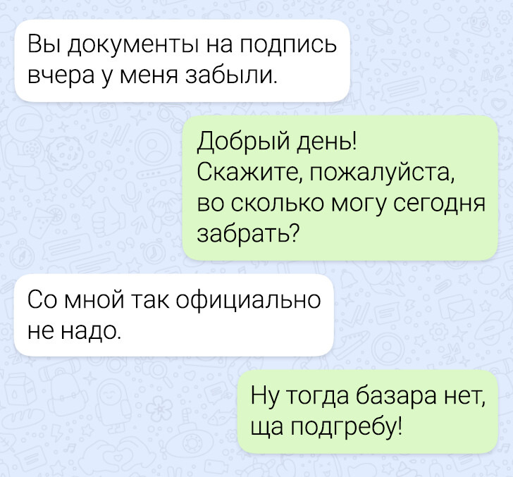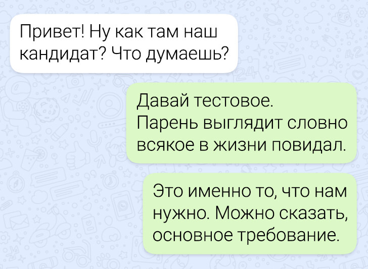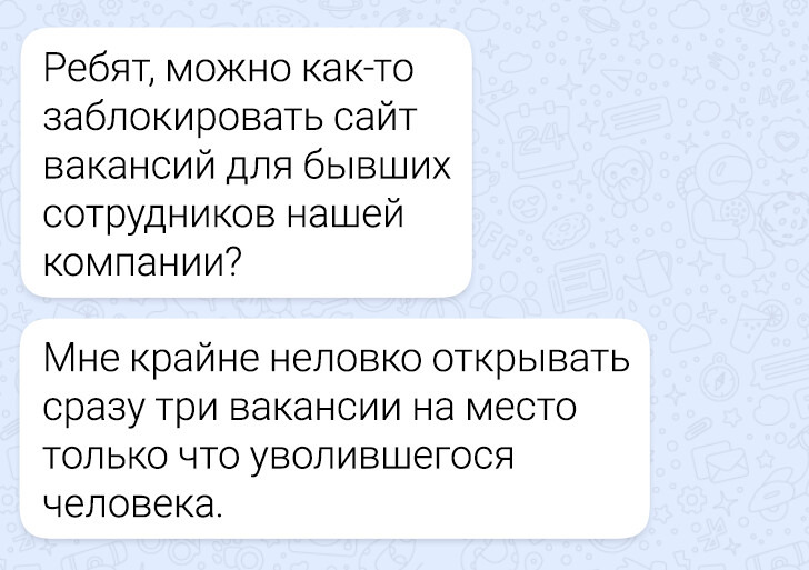 Рабочие чаты — отдельный вид искусства. Здесь рождаются шедевры офисного юмора, неожиданные признания и фразы, которые мгновенно становятся мемами. Мы собрали 20 переписок, которые точно поднимут настроение даже в самый сонный понедельник и напомнят, что в каждом коллективе всегда найдутся и свой комик, и философ, и даже мастер пассивной агрессии.