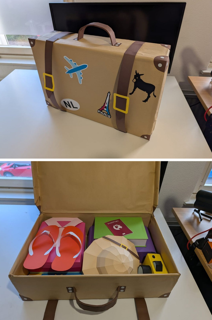 «Помогла жениху с его сюрпризом для тайного Санты. Картонный дорожный чемодан с туристическими принадлежностями внутри»