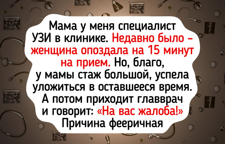 - Мама у меня специалист УЗИ в поликлинике. Недавно было — женщина опоздала на 15 минут на прием. Но, благо, у мамы стаж большой, успела уложиться в оставшееся время. А потом приходит главврач и говорит: «На вас жалоба!» Причина фееричная: «Врач все слишком быстро сделала, хоть я и опоздала». © kurochkacrew / Pikabu