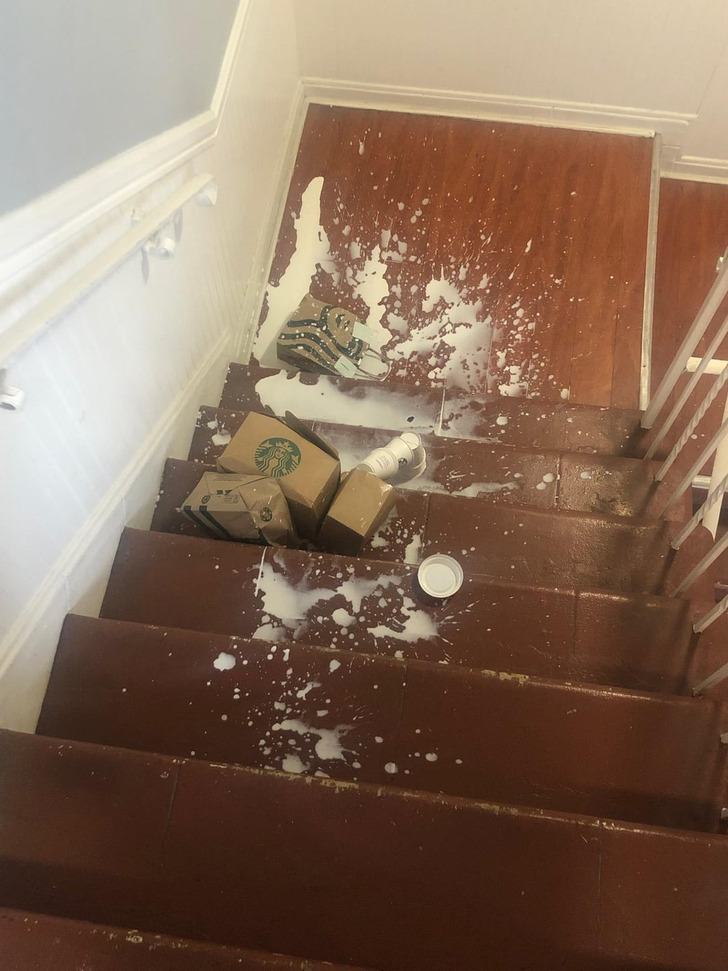 «Увидел это на лестнице возле своей квартиры после того, как услышал громкий шум и получил уведомление об отмене моего заказа»