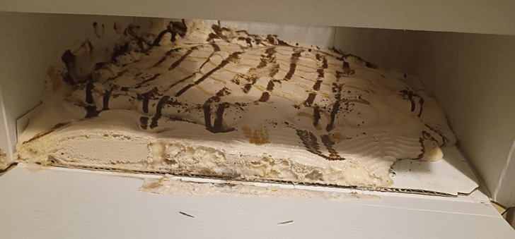 «Когда я говорю „не зная“, я имею в виду, что не думал, что все будет так плохо. Вверху есть окошко, через которое можно посмотреть, и когда я посмотрел в магазине, мне показалась немного подозрительной высота торта, но я решил не придавать этому значения. Пришел домой и увидел вот это. Вернулся в магазин, и оказалось, что все торты в магазине были такими, а этот был самым толстым из трех».