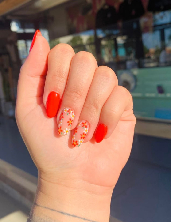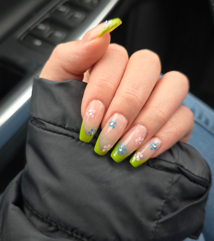 Любые вариации цветочков на ногтях сделают из вас модницу этого сезона. Мастера советуют украшать ими кончики ногтей.