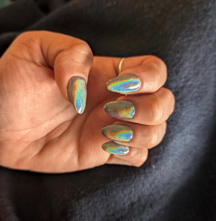 Голографический маникюр — ещё один хит сезона. Если полное покрытие кажется вам слишком смелым, попробуйте сияющий акцент только на кончиках ногтей. Будет смотреться очень необычно.