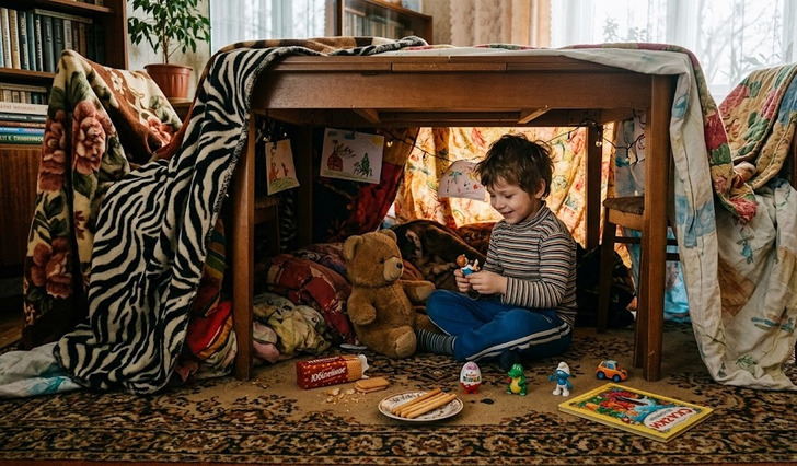 А вы таскали под стол одеяла, пледы и вкусняшки, чтобы соорудить такой домик?