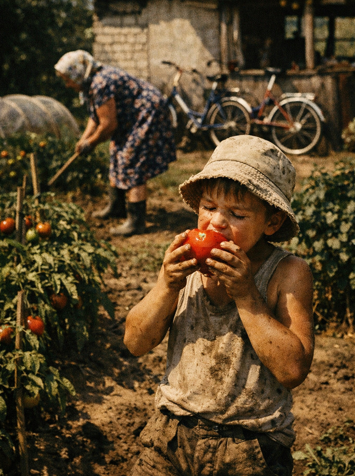 А помните каникулы в деревне? Забегаешь в огород, срываешь огромный помидор прямо с куста, на ходу вытираешь его о футболку — и кусаешь, как яблоко