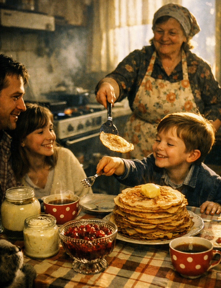 Хрустальная розетка с бабушкиным вареньем, банка сгущенки и кусочек сливочного масла на самой верхушке блинчиков. Самое сложное было — успеть схватить блин с хрустящим краешком, пока за добавкой не потянулись остальные