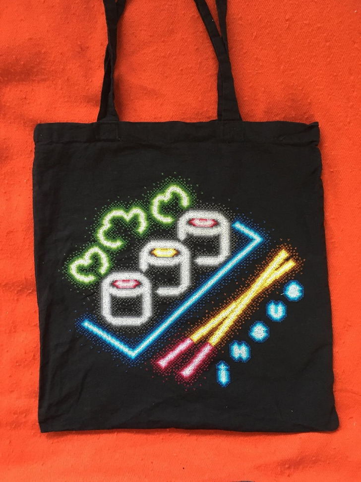 «Спустя 7 мясяцев и 3 страны мой шопер с неоновыми суши наконец-то готов!»