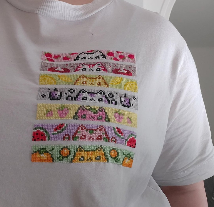 Вышивка на шопере, на джинсовке и фруктовые котики на футболке - то, что не стыдно показать)