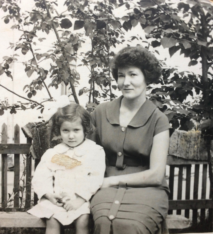 «На этой фотографии мама сидит в новом платье. Оно было цвета морской волны, пуговицы как перламутровые. Я сижу надутая, потому что на мне не такое красивое платье, как у мамы»