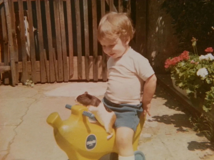 «1991 год. Мне здесь два года и мы с морской свинкой куда-то мчимся на банане»