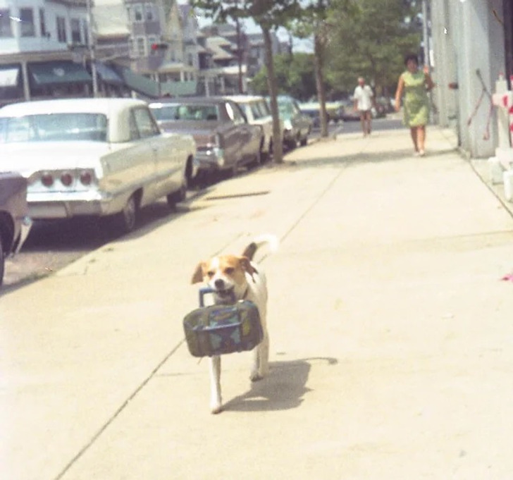 «1970 год. Мой пес Вилли несет сумку моей мамы»