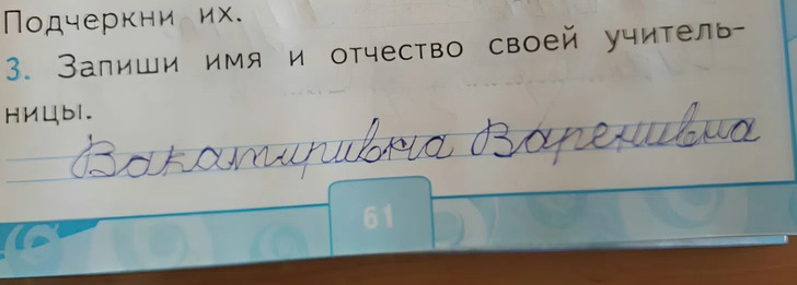 «Учительница первого класса, в который ходит моя дочка, скинула в родительский чат такое фото. Смеется. Зовут ее Екатерина Валерьевна»