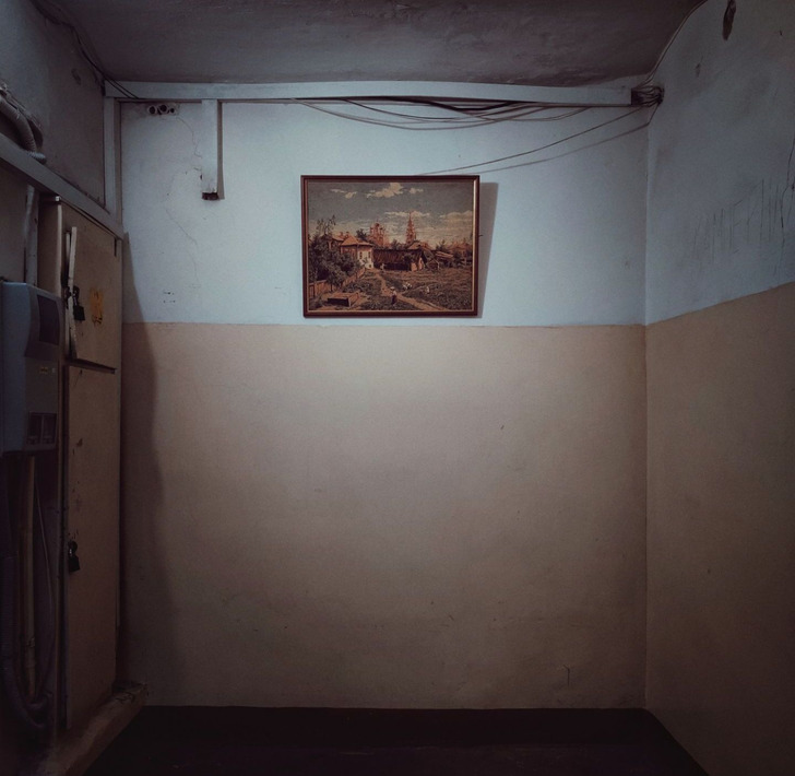 Обычный темный подъезд, со свисающими из короба проводами, десятки лет не беленым потолком, облезлой дверью и репродукцией. Это больше похоже не на парадную, а на черный ход.