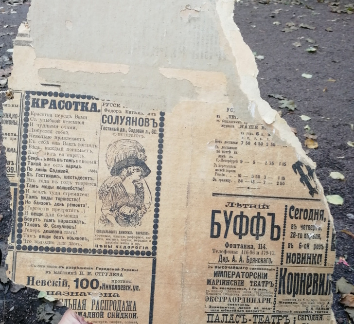 «Стали они обои отдирать. По подсчетам, одиннадцать слоев обоев! И вот под последним они обнаружили эти газеты. На углах стояли даты выпуска от 1900 до 1918 года.