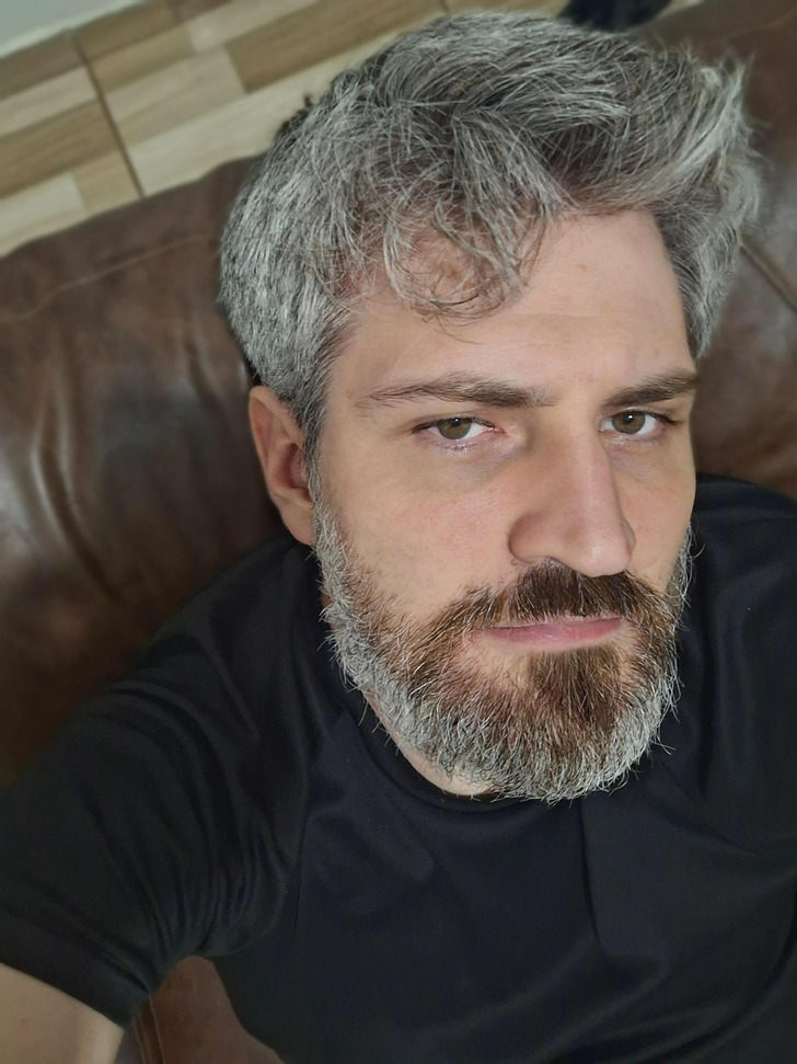 Знала одну женщину, она говорила, что начала седеть уже в 30. И к 35 годам была как этот мужчина. На темных волосах красиво