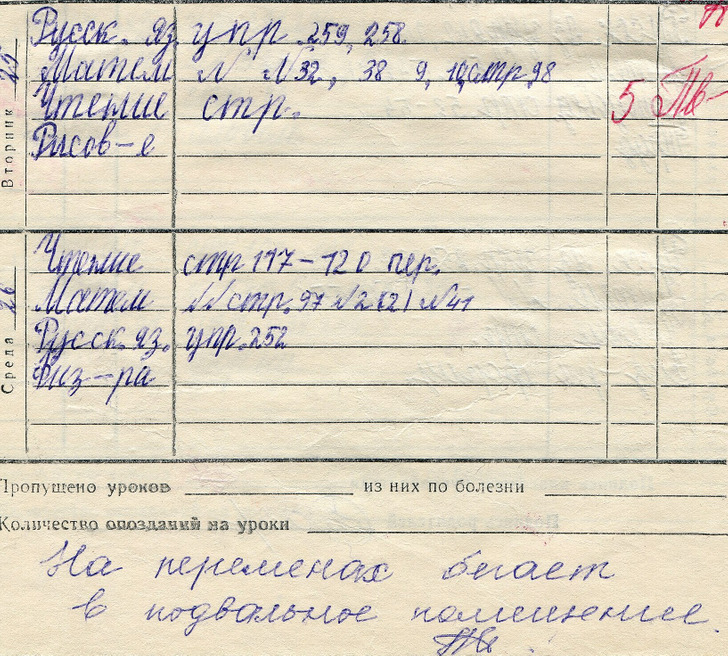- У меня дневники не сохранились, но из того, что помню у себя: «Читал на уроке». Это, кстати, был урок литературы. И еще: «Пожалей мои глаза!» У меня был довольно мелкий почерк, и в конце концов русичка не выдержала. © yumi.eXVtaQ / Pikabu