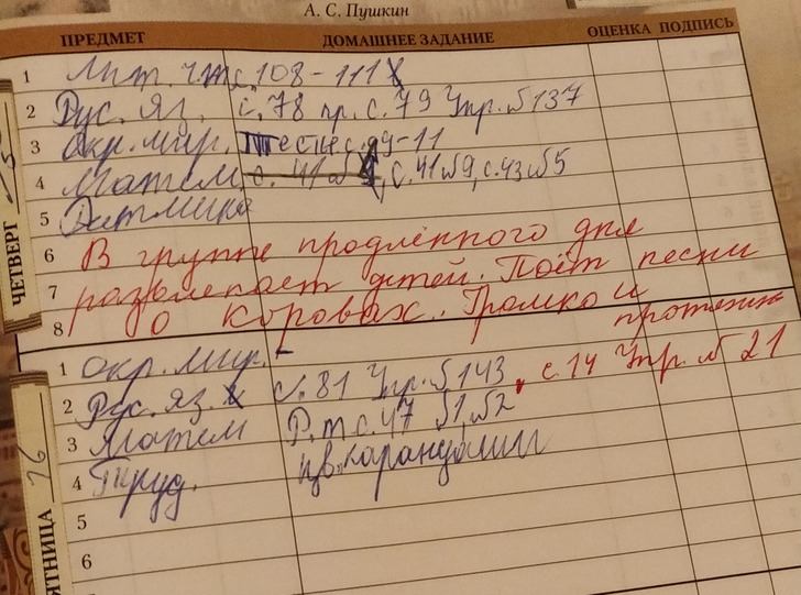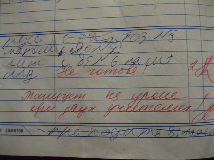 - У меня было замечание «улыбалась на уроке» и рядом огромная «двойка» и подпись учителя на пол страницы. Через неделю однокласснице написали в дневнике «грустила на уроке, 2!»