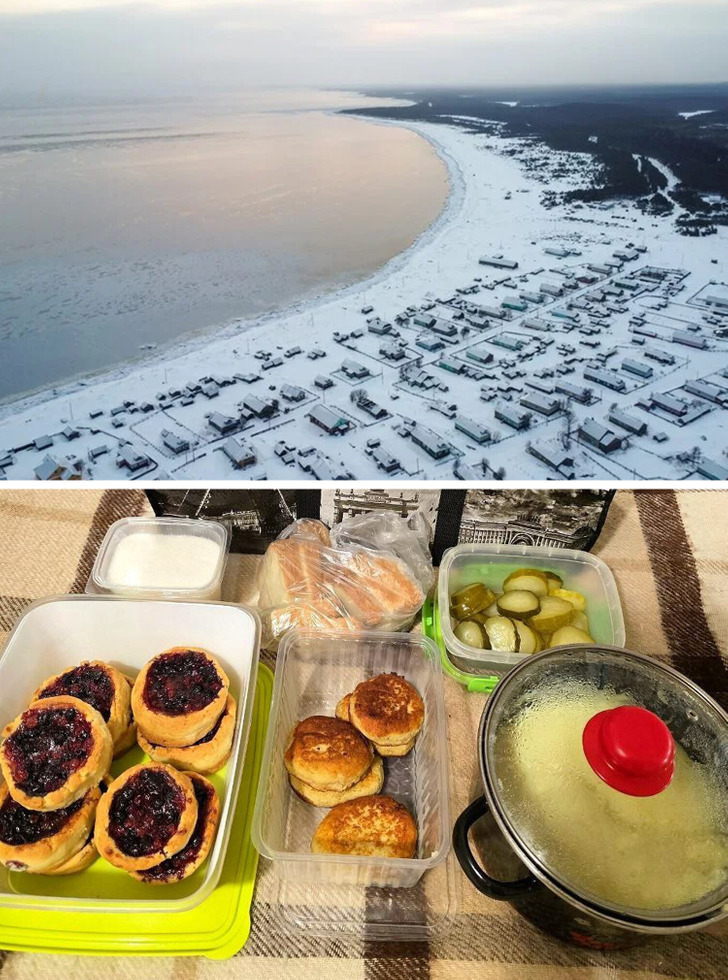 «Это красивейшая поморская деревня: можно гонять на снегоходе, гулять по берегу Белого моря, рыбу ловить с разрешения нацпарка, в музей зайти, в конце концов. Кафешек и клубов там нет. Зато есть условная тетя Лена, которая готовит как богиня. Звоните по номеру, просите просто „ужин“ без уточнений и получаете вот это»