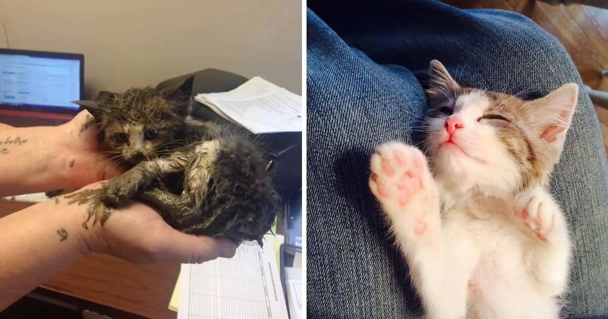 «Было холодно, и котенок застрял в замерзшей грязи, когда мы его нашли. После нескольких месяцев в приюте его наконец-то взяла любящая семья»