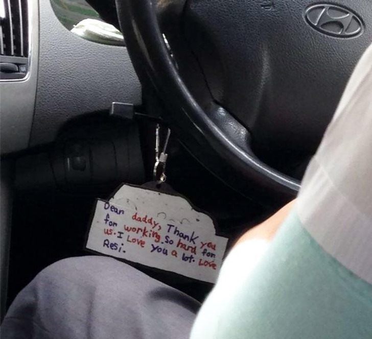 Надпись на записке: «Дорогой папуля! Спасибо, что так тяжело работаешь ради нас. Я очень тебя люблю. С любовью, Рези!»