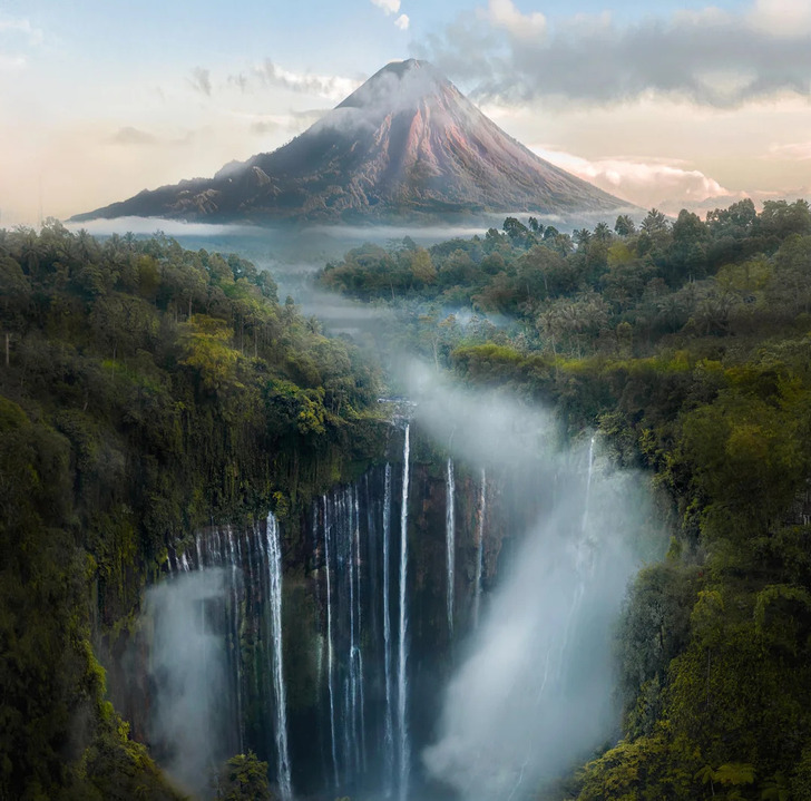 «Индонезия, место, где за водопадами возвышается вулкан»