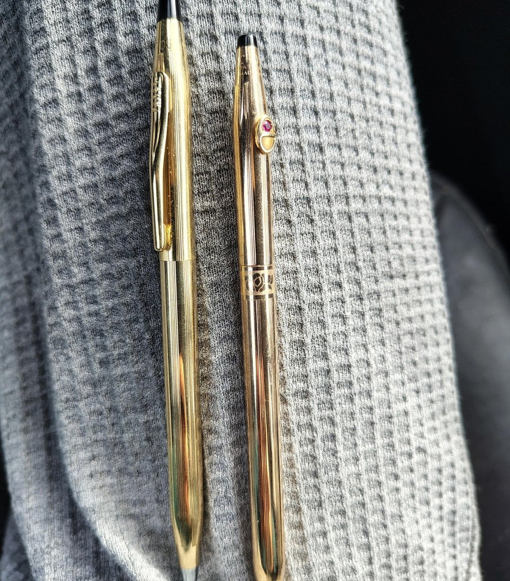 «Золотые ручки (14 и 12 карат)! Нашел в местном секонде симпатичный набор. Решил рассмотреть поближе, а оказалось, что это золото, да еще и в одной есть настоящий рубин. И все это в родном кожаном футляре!»