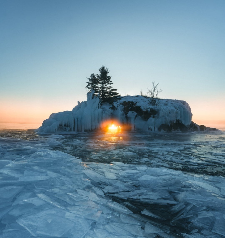«Я так рад, что заставил себя встать ради этого рассвета в —26°C! В году бывает всего несколько дней, когда восходящее солнце идеально совпадает с отверстием в скале»