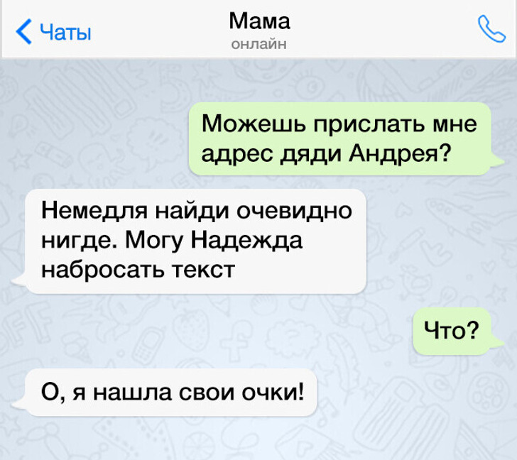 Курьезы в переписке случаются со всеми, но именно в переписке с родителями они самые интересные и незабываемые. Потому что наши мамы и папы всегда искренние, и в СМС это видно как нельзя лучше! Мы подобрали для вас переписки, в которых вся суть наших отношений с родителями и весь их искренний юмор.